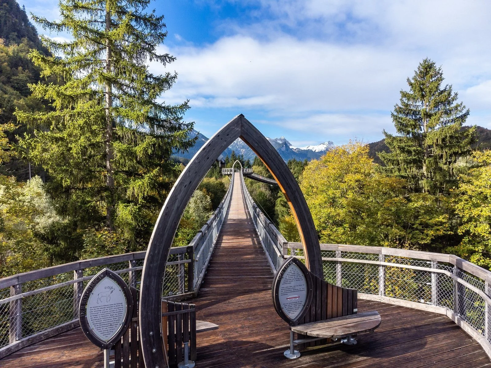 Прогулянка підвісним мостом над річкою Лех серед верхівок дерев.